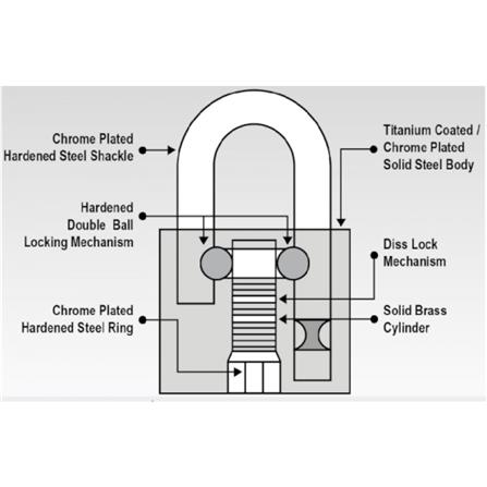 - Chrome plated hardened steel shackle.