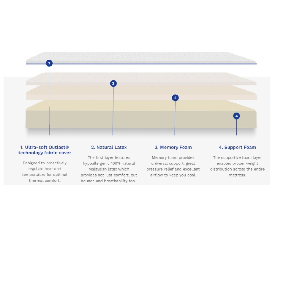 Our award-winning 3-layer mattress combines the very best materials - 100% natural Malaysian latex, memory foam, and support foam. It's the perfect combination for the comfort and support you need to wake up feeling refreshed after a good night's sleep.