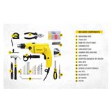 This 560-watt impact drill form STANLEY is ideal for drilling concrete, wood, metal, tiles, etc. Also, the drill can be used to drive screws or bolts. Its sturdy aluminum motor provides powerful operation at stabilized speed. Thanks to the variable speed and rotating direction adjustment, the drill is versatile enough to tackle all technical tasks. Plus, the durable body structure is designed for long-lasting lifetime. The hammer drill kit contains 120 pieces, including hammer drill, drill bits, screwbit holder, hammer, measurement tape, utility knife, universal plier, Lineman tester, Allen key set, interchangeable screw bits, screws & plug set and other tools