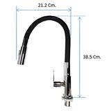 The single sink faucet is designed for versatile use in kitchens and bathrooms, featuring a body made from chrome-plated stainless steel and a handle made from chrome-plated zinc. Its flexible pipe, covered in soft black rubber, allows for easy adjustment and maneuverability.