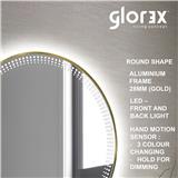 The Glorex LED Dotted Design Mirror is an 80cm round mirror with a 28mm gold aluminium frame and both front and back LED lighting. Featuring a unique dotted design, it offers customizable lighting with 3 color-changing settings and a dimming function via a hand motion sensor. Ideal for bathrooms, dressing rooms, or salons, it combines modern aesthetics with functional lighting, providing a stylish and efficient solution for grooming, makeup application, or general use.