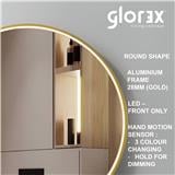 The Glorex LED Mirror PL70A402-HSLED(GGD) is a modern, pill-shaped mirror featuring a 40mm gold aluminium frame and front LED lighting for optimal illumination. It is equipped with a hand motion sensor that allows for 3 color-changing options and dimming functionality, offering customizable lighting for various needs. Ideal for bathrooms, dressing rooms, or salons, this mirror combines sleek design with practical features, making it a stylish and efficient addition to any space.