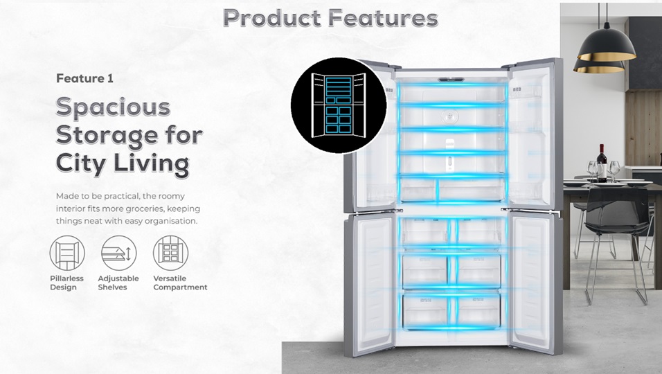 750L 4 Door Refrigerator, J-Tech Inverter, Plasmacluster Technology Anti-bacterial Deodorizer Hybrid Cooling, Touch Control Door Panel, Extra Cool Compartment Recessed Handle, Express Freezing, Deep Freezing -24'C, External Door Control Panel White Glass Door
