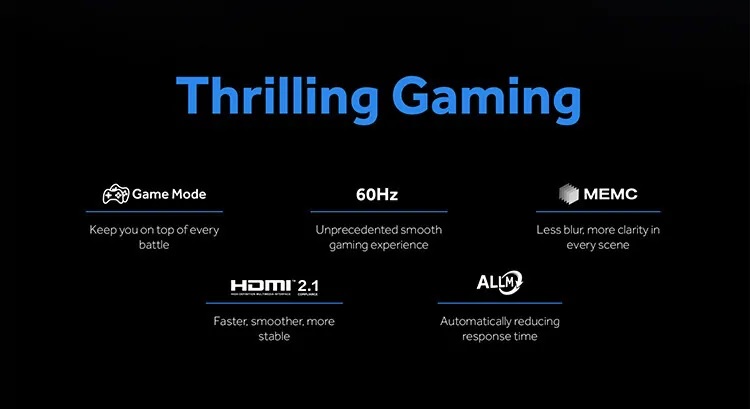 Gamers will appreciate HDMI 2.1 compliance, supporting Dynamic HDR, eARC, and high-speed motion handling for fluid visuals, as well as Auto Low Latency Mode (ALLM), which automatically minimizes lag for precise responsiveness in gameplay.