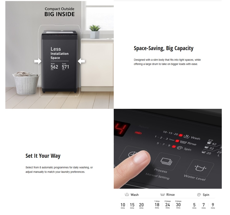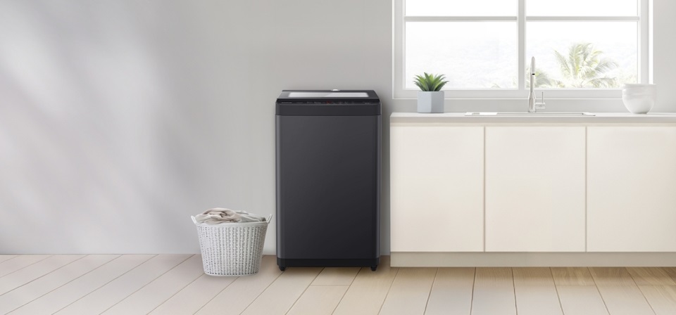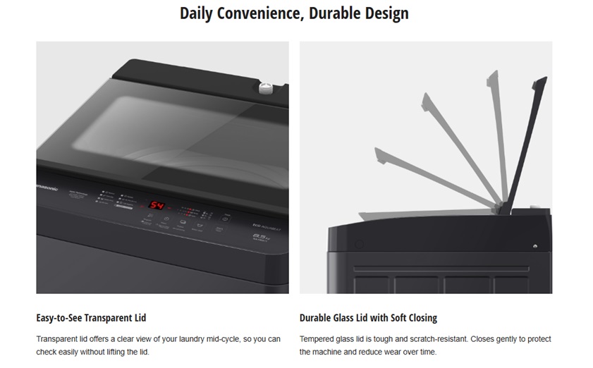 Panasonic NA-F85S11BRT - 8.5KG Top Load Washer delivers powerful cleaning with Eco AquaBeat and Dancing Water Flow, providing 16% better washing for tough stains. It features a soft-closing tempered-glass lid, 8 automatic programs with manual settings, and Japan-quality reliability backed by a 12-year motor warranty.