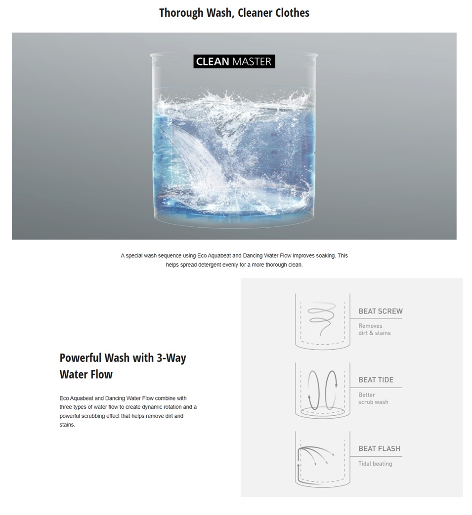 • Effectively removes dirt with a powerful combination of various water flows - Eco AquaBeat, Dancing Water Flow