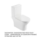 This Akron washdown two-piece rimless toilet features a 250mm S-trap, reliable Yingbao flushing system, and a durable UF soft-close seat cover, offering hygienic performance and everyday comfort for modern bathrooms.
