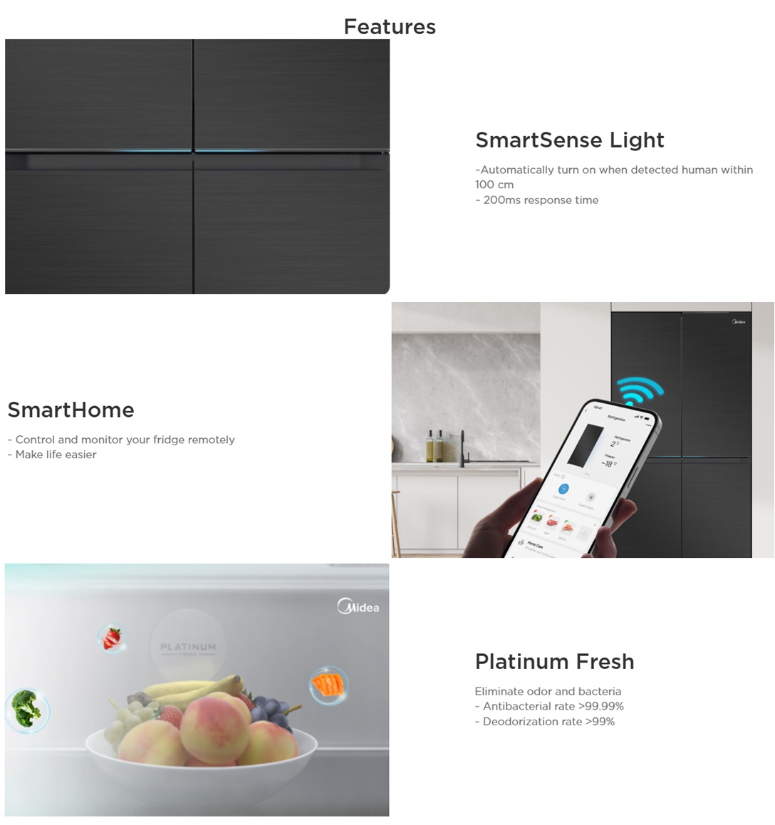 Midea MDRF923FIE45MY is an 810L multi-door refrigerator featuring Inverter Quattro for energy efficiency, SmartSense lighting, Vario Zone flexible storage, Platinum Fresh deodorisation, Flash Cooling, SmartHome app control, and eco-friendly R290 refrigerant, ideal for large households needing smart, spacious food storage.