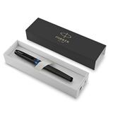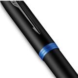 • Parker pen with all-black finishes and marine blue ring accents