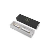 Refined pearl lacquered barrel and cap engraved with a modern asymmetrical square pattern are complemented by gold trims and the signature PARKER arrow clip