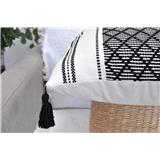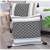 • Features a clean black and white geometric pattern with tassel details.