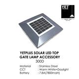 A durable and energy-efficient YETPLUS solar LED top gate lamp designed for 300mm posts, offering dual lighting options (warm white and daylight) with a modern look for enhanced outdoor illumination and style.