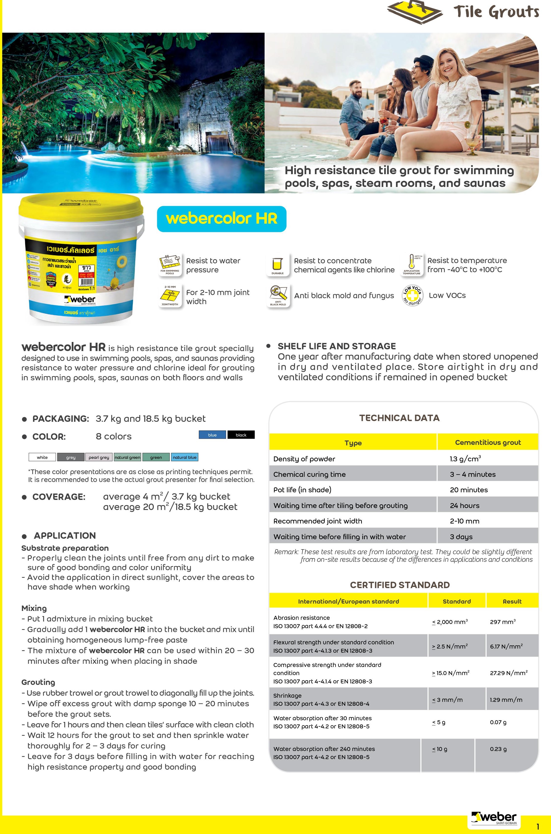 • Ideal for grouting in swimming pools, spas, saunas on both