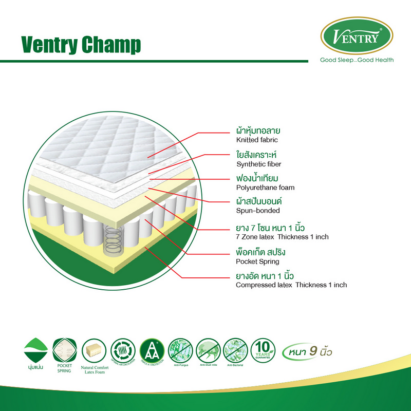 Mono-zone latex mattress from VENTRY CHAMP comes with spring pocket system, is supported compressed Latex, and offers special soft and dense touch. This is ideal for anyone who prefers highly elastic mattress with shape retention. Moreover, for your best hygiene, the mattress is manufactured of fine Viscose cotton, and coated with anti-dust mites, anti-mold, and anti-bacteria substances. This ensure that you have a safe & sound sleep every night.