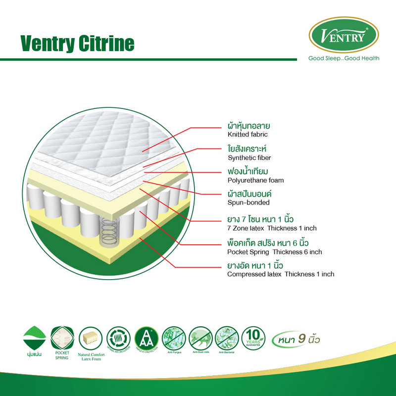 Latex mattress from VENTRY CITRINE comes with pocket spring system, and is supported with 100% pure Latex for soft and comfortable touch. This is ideal for anyone who prefers highly elastic mattress with great shape retention.