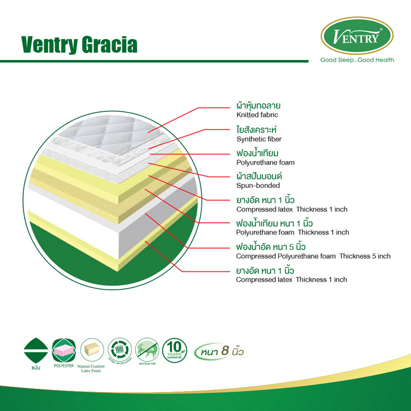 VENTRY GRACIA mattress are the combination of 100% natural latex top layer, with high-density compressed polyurethane layer support. This mattress comes with ergonomic design to provide extra firm support for body pressure, this is also perfect for anyone who has backache. Moreover, the mattress cover is anti-dust mites.