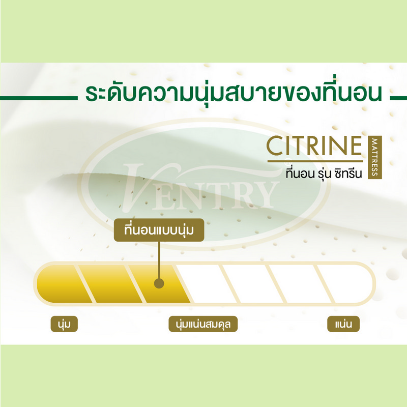 Latex mattress from VENTRY CITRINE comes with pocket spring system, and is supported with 100% pure Latex for soft and comfortable touch. This is ideal for anyone who prefers highly elastic mattress with great shape retention.