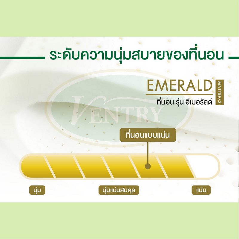 Mono-zone latex mattress from VENTRY EMERALD comes with pocket spring system, is supported with compressed Latex underneath, and offers special soft and dense touch. This helps reduce backache by keeping your spine in a straight line. Moreover, for your best hygiene, the mattress cover is manufactured of imported fabric which is anti-dust mites, anti-mold, and anti–bacteria. This ensure that you have a safe & sound sleep every night.
