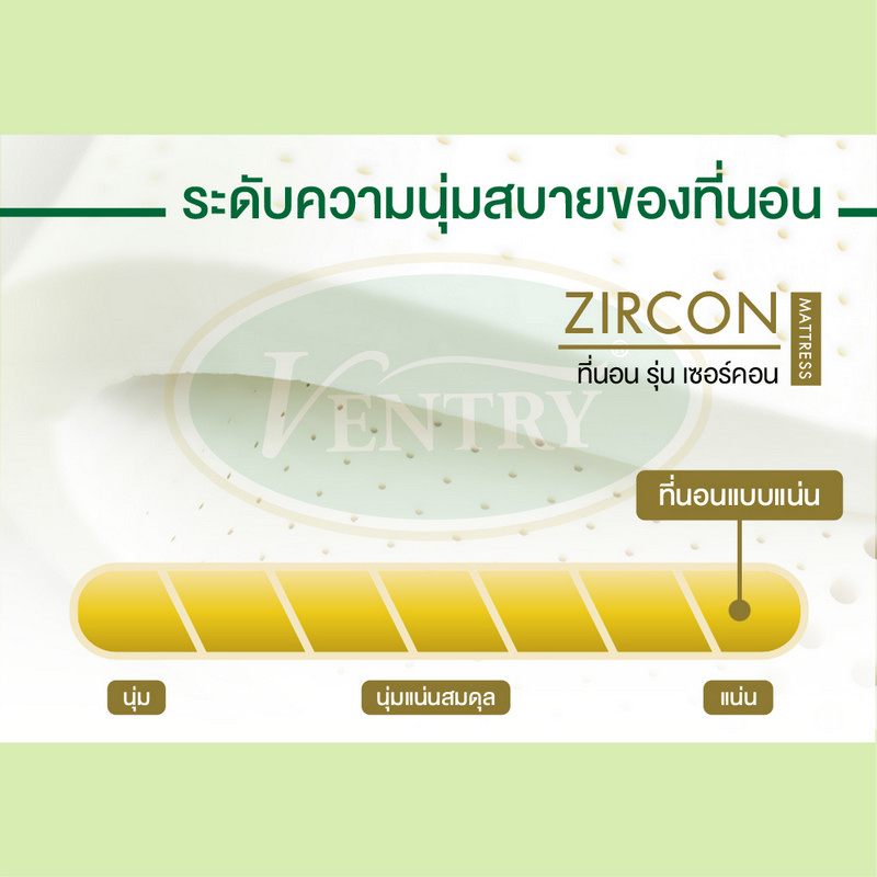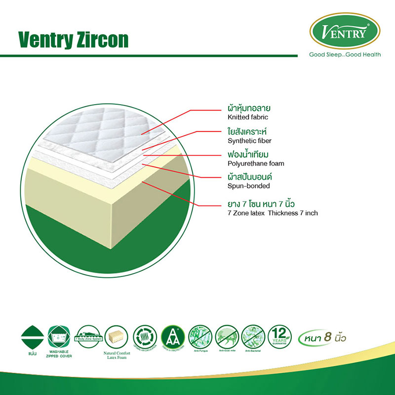 Flippable Latex mattress from VENTRY ZIRCON features with 7 Body Zone System which is personalized for each body parts (especially the heavy pressure at the hip and waist), helps improved weight distribution. And for your peace of mind, the mattress cover is made of special fabric improved ventilation, and coated with Triple-A protection for anti-dust mites, anti-mold, and anti–bacteria. Moreover, the cover is washable and comes with zipper disclosure.