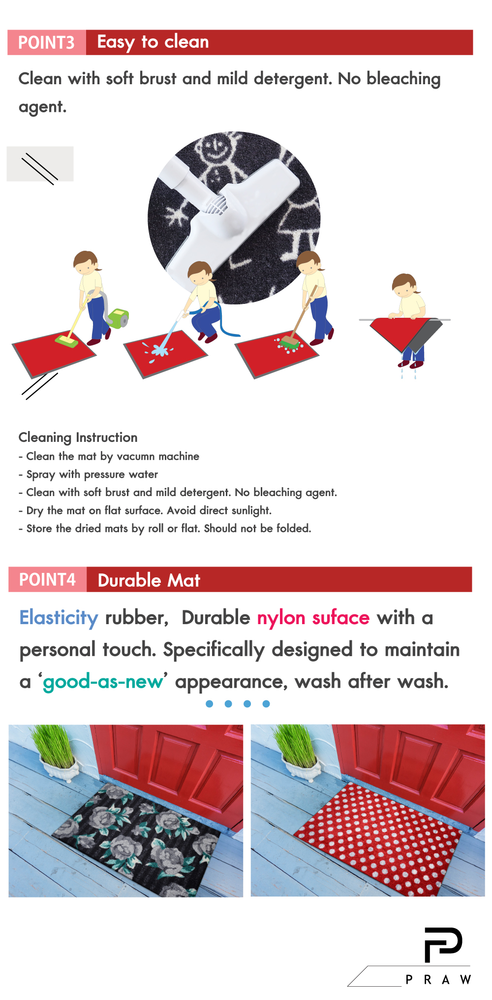 Avoid placing the rug on the extremely wet or slippery floor. Keep away from heat.