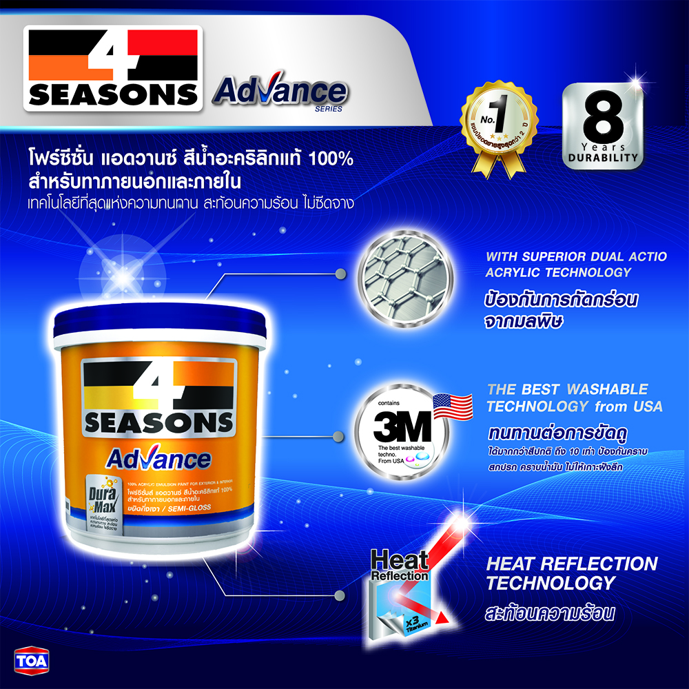 TOA 4 SEASONS ADVANCE is formulated from 100% acrylic emulsion. The Cool Power features reflects up to 95% of heat, helping to reduce the surface temperature for 12%. Guaranteed with “Durable Power”, this paint film is 4 times stronger than any other paints. With its excellent surface adhesion and hiding power, the paint offers satisfying sealing and high coverage area. Thanks to its special pigment, TOA 4 SEASONS is able to withstand tropical climate and harsh weather conditions. Apart from the anti-fungus component, this high-quality interior paint is also free from added lead and mercury for the best health conditions of you and your loved ones.