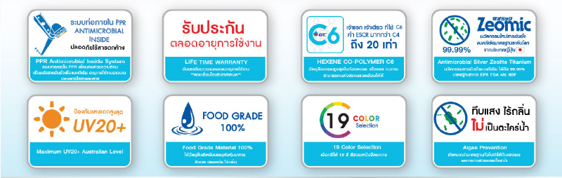 Water tank from WAVE is made from Food Grade material and comes with Triple Action that inhibits bacteria in water tank, PPR pipe and float ball. Plus, Antimicrobial Silver Zeolite Titanium eliminates bacteria and microorganism up to 99.99% for water cleanliness. Moreover, the tank comes in a modern design which makes it ideal for installing in various styles of houses.