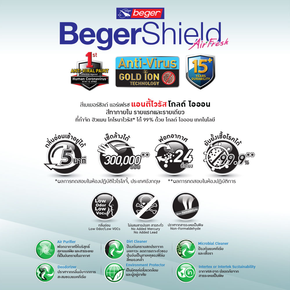 This water-based paint is ideal for houses or any areas where fresh and clean air is a vital hygienic factor. With the innovative AIR CLEAN property from the technology of Titanium-oxide, the paint is able to purify air to make your room clean. It is also able to effectively eliminate dirty and toxic compound including bacteria, germs and mold. Plus, the BIO CLEAN technology generates air purifying process, making your room clean from bacteria and unpleasant odors.